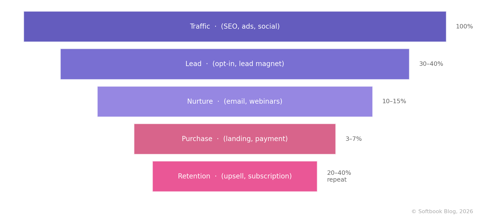 Stage 1 — Traffic. People discover you through SEO blogs, social media (Instagram, TikTok, YouTube), targeted ads, or affiliate programs. Your goal: attract attention and deliver free value.