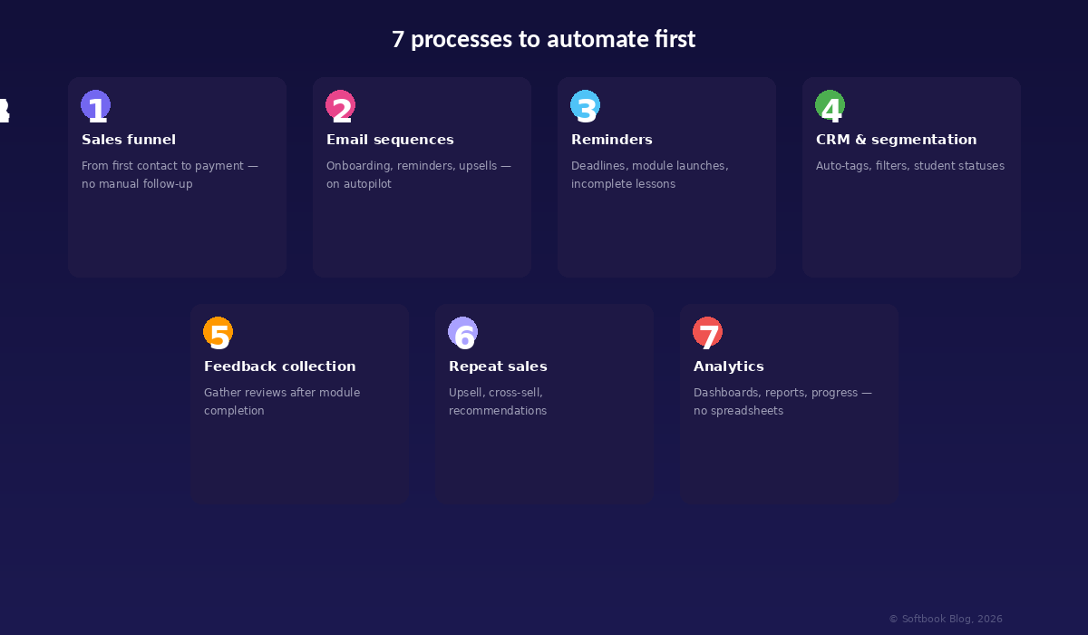 The minimum set: automatic access delivery after payment, a 3-email onboarding sequence, reminders about incomplete lessons. Even these three things will save you 10–15 hours per week and let you focus on what you do best — creating content.