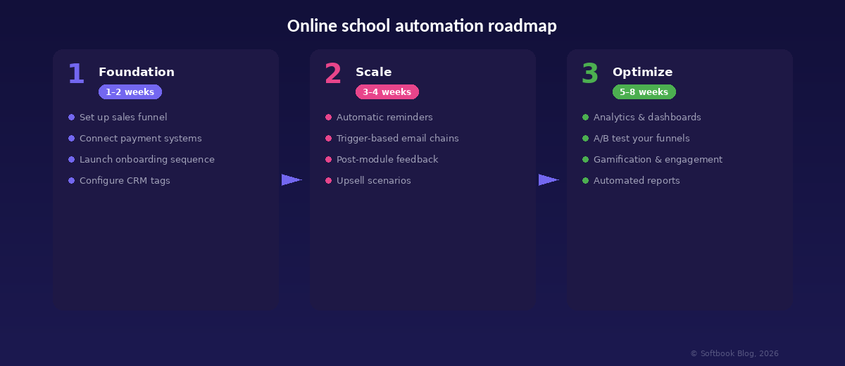 Once the foundation is running smoothly, add automated reminders for students (incomplete lessons, missed deadlines, new modules), trigger-based email sequences for different scenarios, post-module feedback collection, and upsell sequences for course graduates.