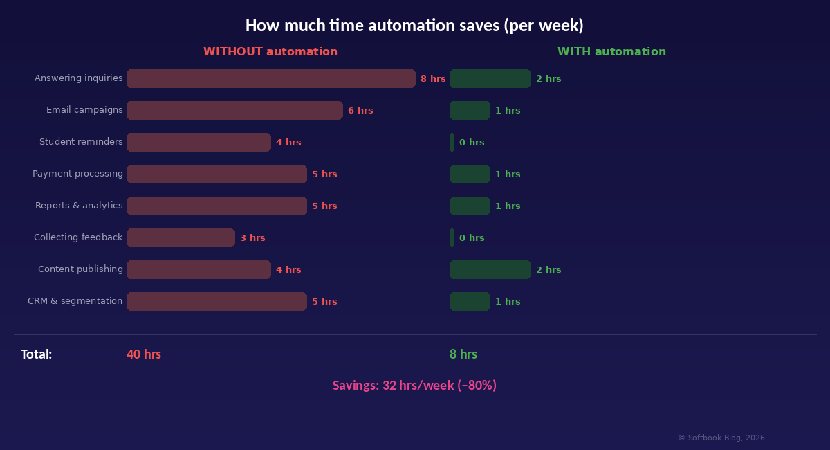 Let’s do the math. A typical online school with 500+ students spends roughly 40 hours per week on manual tasks. After automating key processes, that number drops to 8 hours — an 80% reduction.