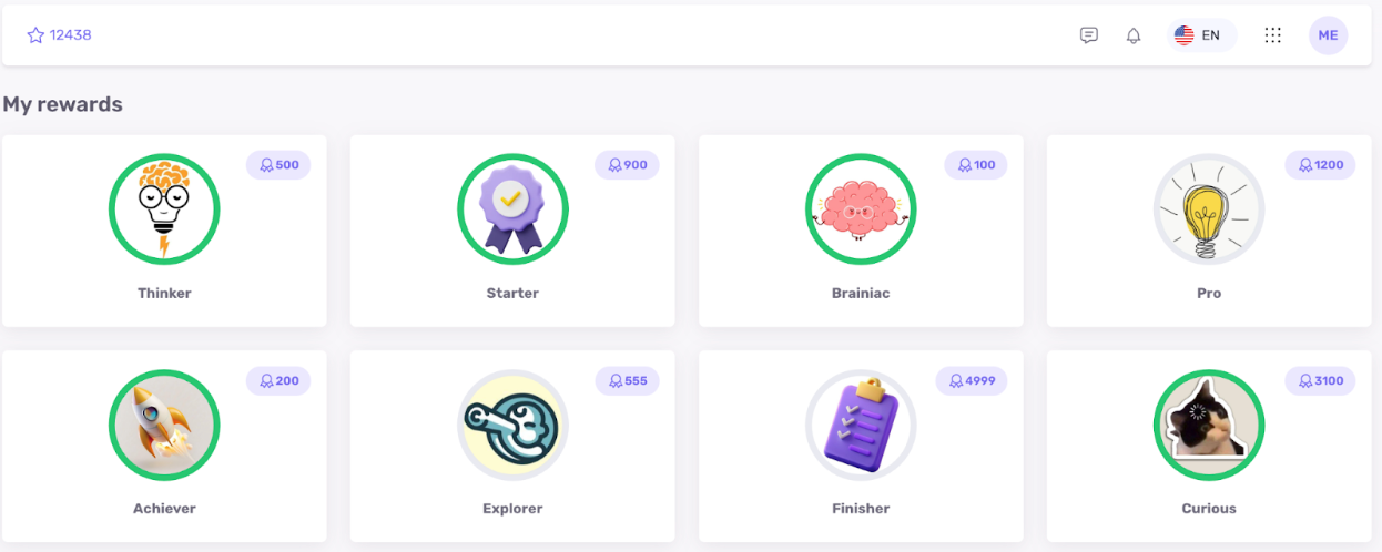 - Видимость награды до получения; если студент в процессе, он видит прогресс.