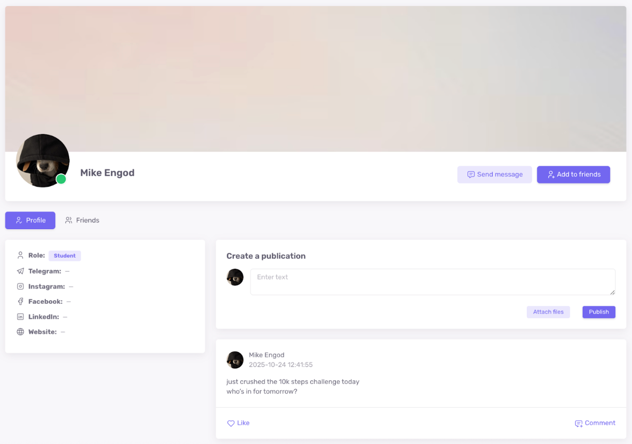 Социальная сеть добавляет живое взаимодействие: личные профили, публикации, комментарии, лента. Здесь можно анонсировать новые курсы и продукты, собирать отклики, вовлекать студентов в обсуждения и создавать экспертные рубрики. В итоге обучение становится не только эффективным, но и по-настоящему вовлекающим.