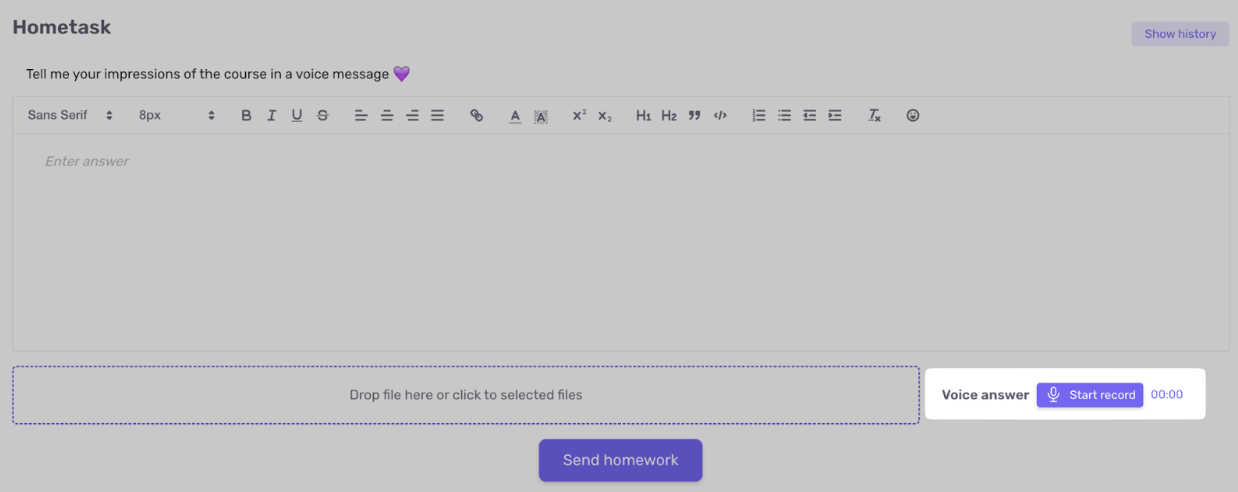 - В настройках урока (на этапе создания ДЗ) можно разрешить голосовые ответы. Аудио отправляется вместе с текстом и файлами.