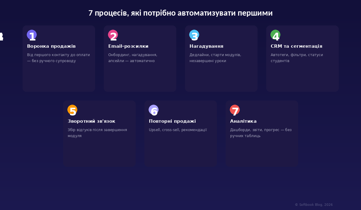 Мінімальний набір: автоматична видача доступу після оплати, онбординг-серія з 3 листів, нагадування про незавершені уроки. Навіть ці три речі зекономлять 10–15 годин на тиждень і дозволять зосередитися на тому, що ви робите найкраще — на створенні контенту.