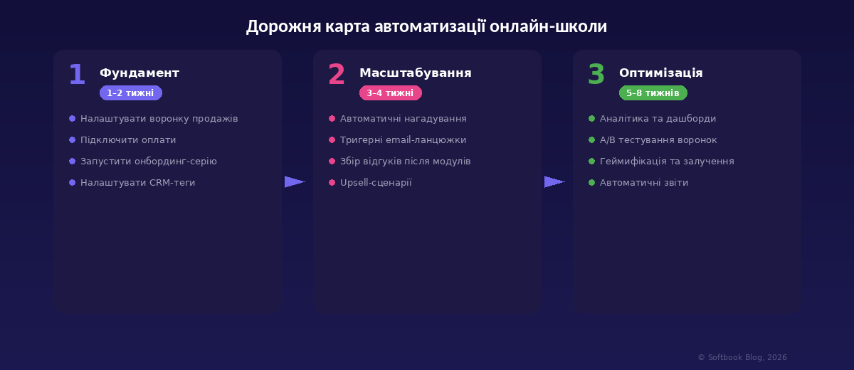 Коли фундамент працює стабільно, додайте автоматичні нагадування для студентів (незавершений урок, пропущений дедлайн, новий модуль), тригерні email-ланцюжки для різних сценаріїв, збір відгуків після завершення модулів та upsell-сценарії для тих, хто закінчив курс.