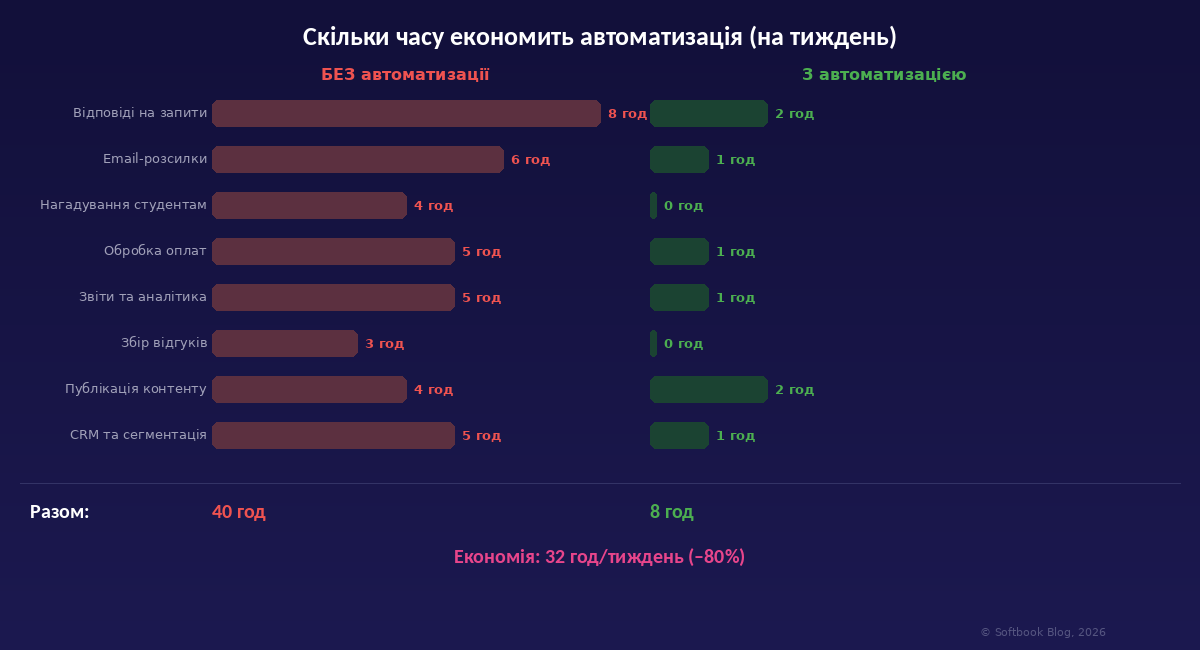Давайте порахуємо конкретно. Типова онлайн-школа з 500+ студентами витрачає на ручну роботу приблизно 40 годин на тиждень. Після автоматизації ключових процесів ця цифра падає до 8 годин — економія 80%.