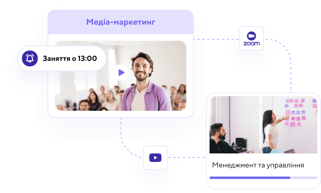 Используйте интеграцию с Zoom и YouTube для упрощения управления виртуальными классами, не покидая нашу платформу. Проводите онлайн-занятия, живые сессии и вебинары — всё в одном месте. -